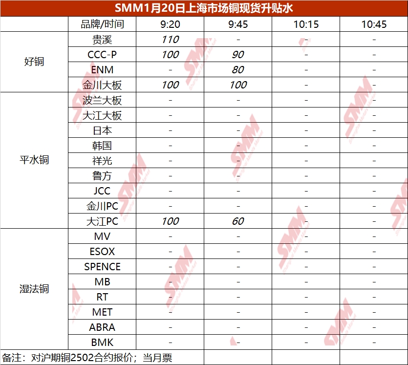 1月20日上海市场铜现货升贴水(第二时段)【SMM价格】