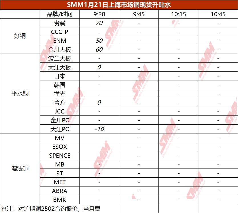 1月21日上海市场铜现货升贴水(第一时段)【SMM价格】