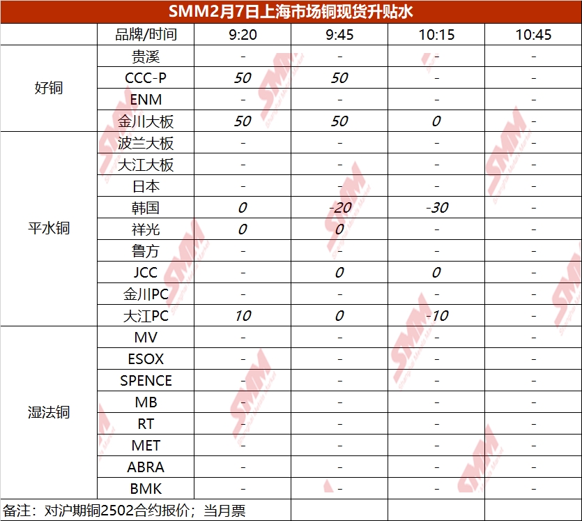 2月7日上海市场铜现货升贴水(第三时段)【SMM价格】