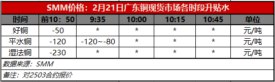 2月21日广东铜现货市场各时段升贴水(第一时段9:30)【SMM价格】