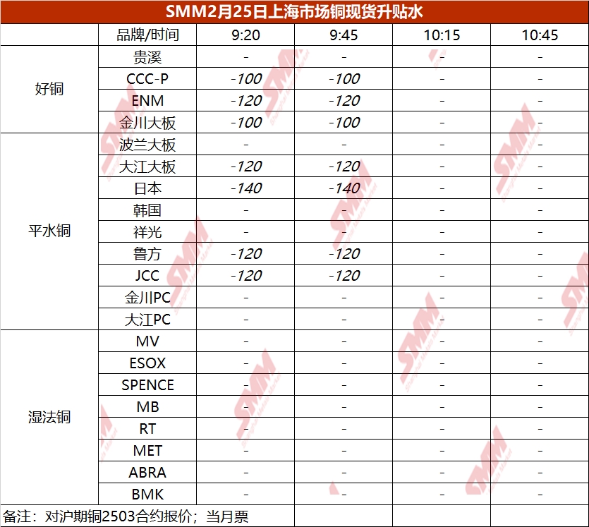 2月25日上海市场铜现货升贴水(第二时段)【SMM价格】