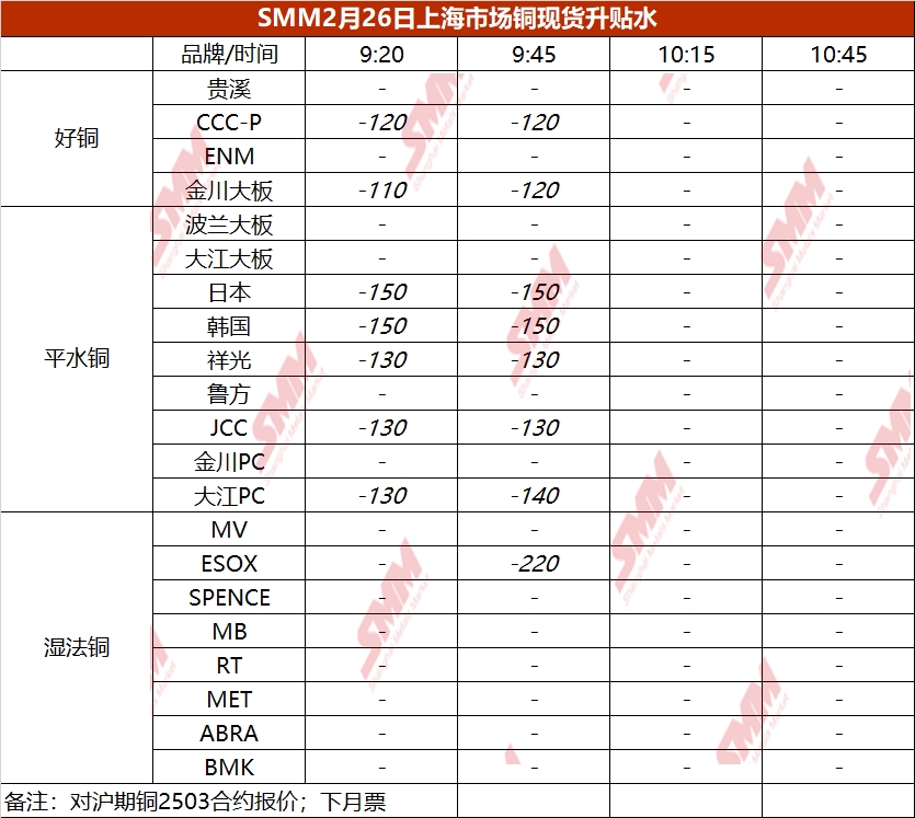 2月26日上海市场铜现货升贴水(第二时段)【SMM价格】