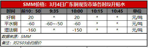 3月4日广东铜现货市场各时段升贴水(第二时段10:00)【SMM价格】