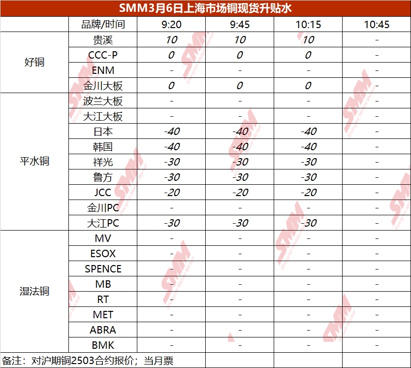 3月6日上海市场铜现货升贴水(第三时段)【SMM价格】