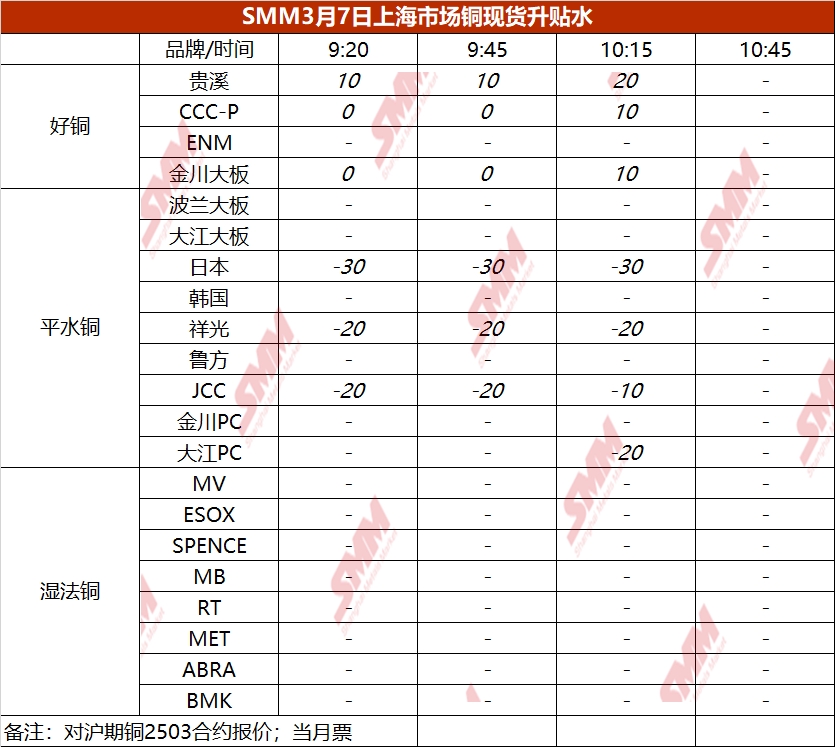 3月7日上海市场铜现货升贴水(第三时段)【SMM价格】