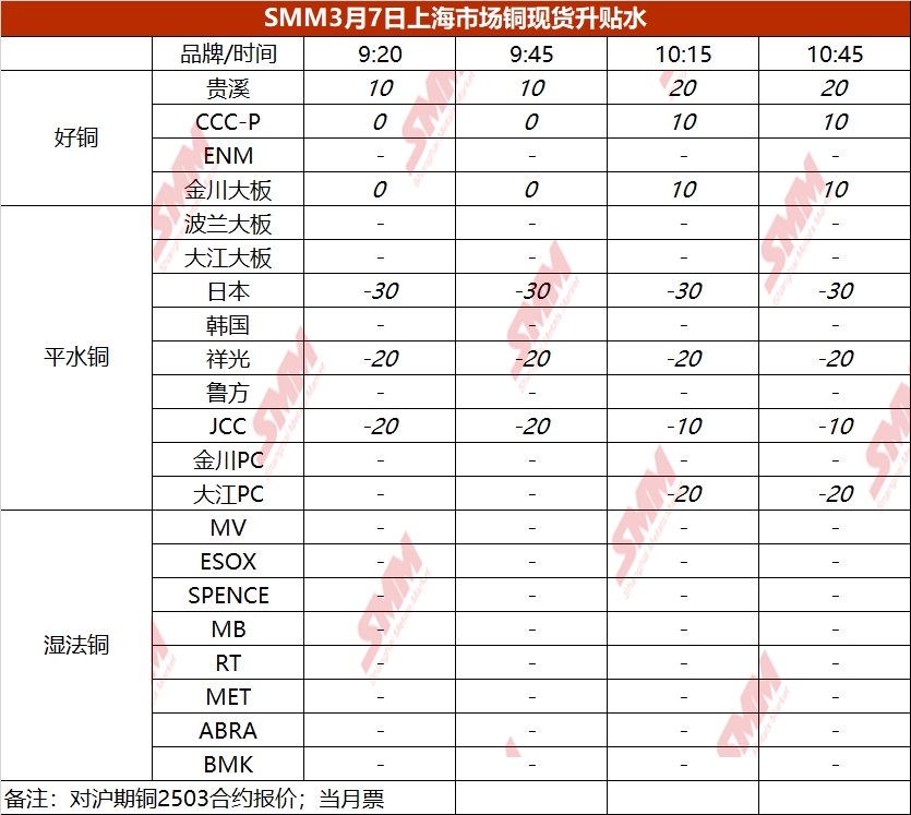 3月7日上海市场铜现货升贴水(第四时段)【SMM价格】