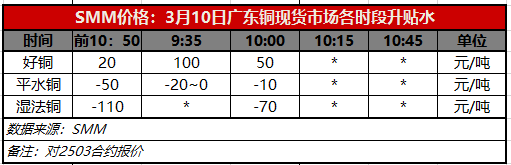 3月10日广东铜现货市场各时段升贴水(第二时段10:00)【SMM价格】