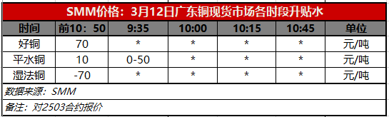 3月12日广东铜现货市场各时段升贴水(第一时段9:30)【SMM价格】