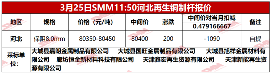 3月25日SMM河北地区再生铜制杆报价