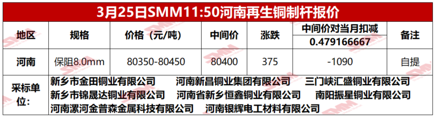 3月25日SMM河南地区再生铜制杆报价