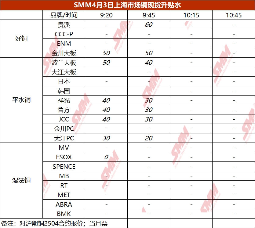 4月3日上海市场铜现货升贴水(第三时段)【SMM价格】