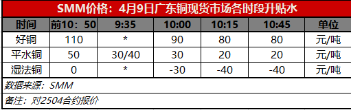 4月9日广东铜现货市场各时段升贴水(第四时段10:45)【SMM价格】