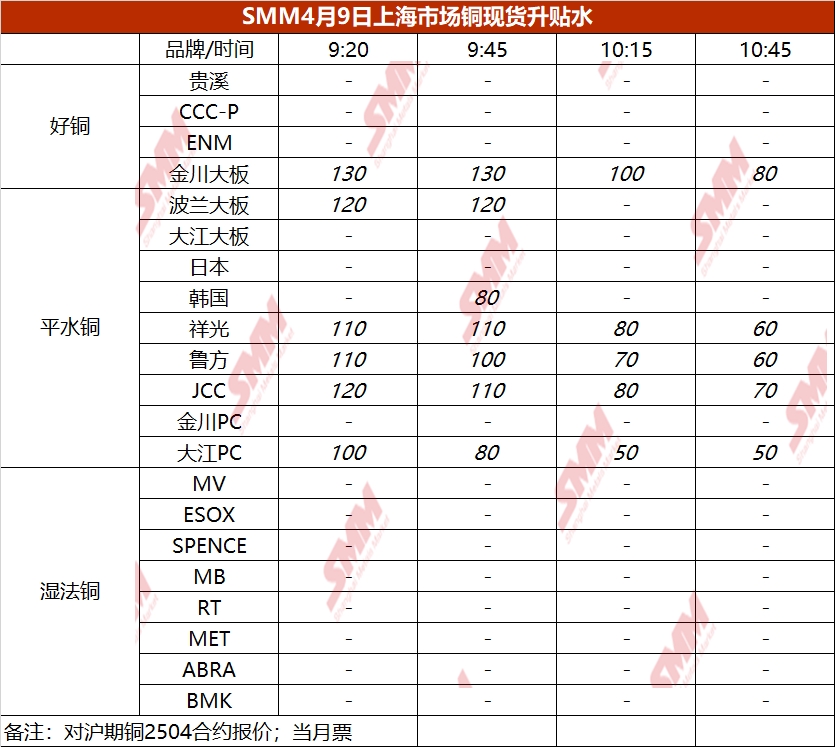 4月9日上海市场铜现货升贴水(第四时段)【SMM价格】
