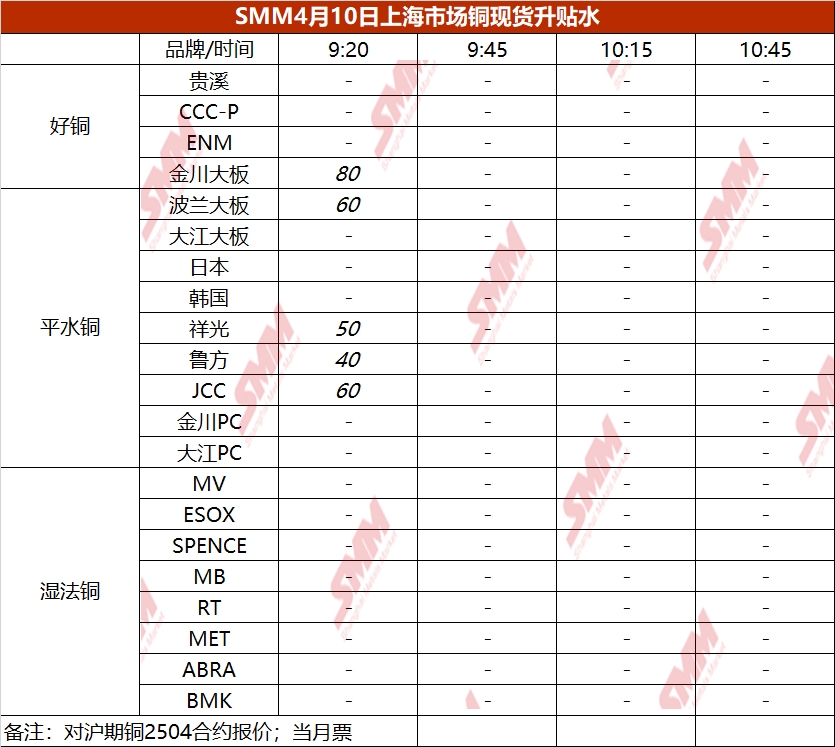 4月10日上海市场铜现货升贴水(第一时段)【SMM价格】