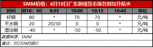 4月10日广东铜现货市场各时段升贴水(第三时段10:15)【SMM价格】