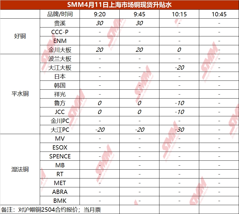 4月11日上海市场铜现货升贴水(第三时段)【SMM价格】