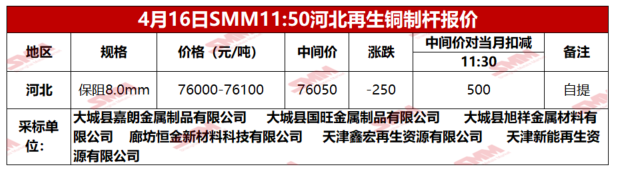 4月16日SMM河北地区再生铜制杆报价