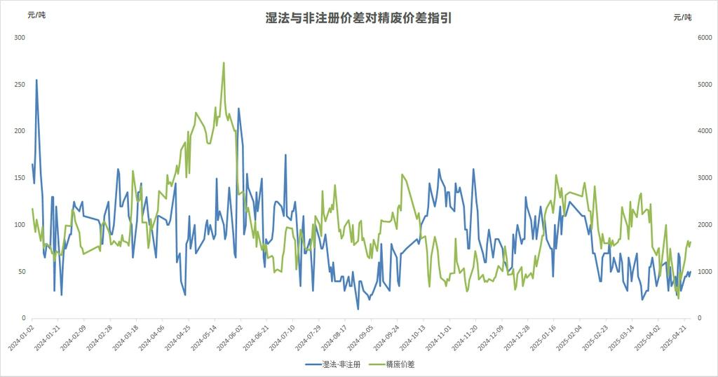 观察非注册与湿法铜价差持续收敛,对于精废价差具有指引性作用。当非注册与湿法价格呈现收敛/走扩趋势时,精废价差亦将趋向收敛/走扩;其对精废价差指引性可提前一周。