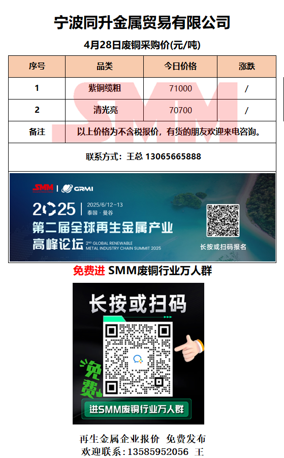 4月28日同升金属 废铜采购报价