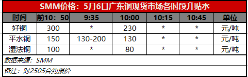 5月6日广东铜现货市场各时段升贴水(第二时段10:00)【SMM价格】