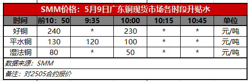 5月9日广东铜现货市场各时段升贴水(第二时段10:00)【SMM价格】