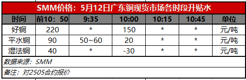 5月12日广东铜现货市场各时段升贴水(第二时段10:00)【SMM价格】