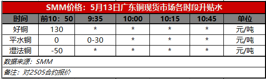 5月13日广东铜现货市场各时段升贴水(第一时段9:30)【SMM价格】