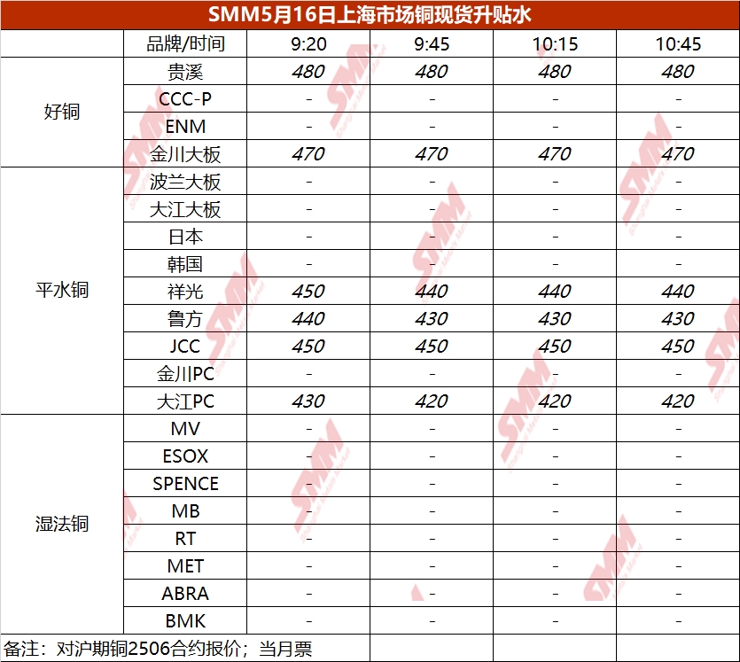 5月16日上海市场铜现货升贴水(第四时段)【SMM价格】
