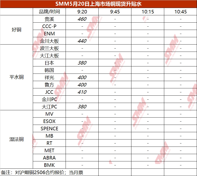 5月20日上海市场铜现货升贴水(第一时段)【SMM价格】