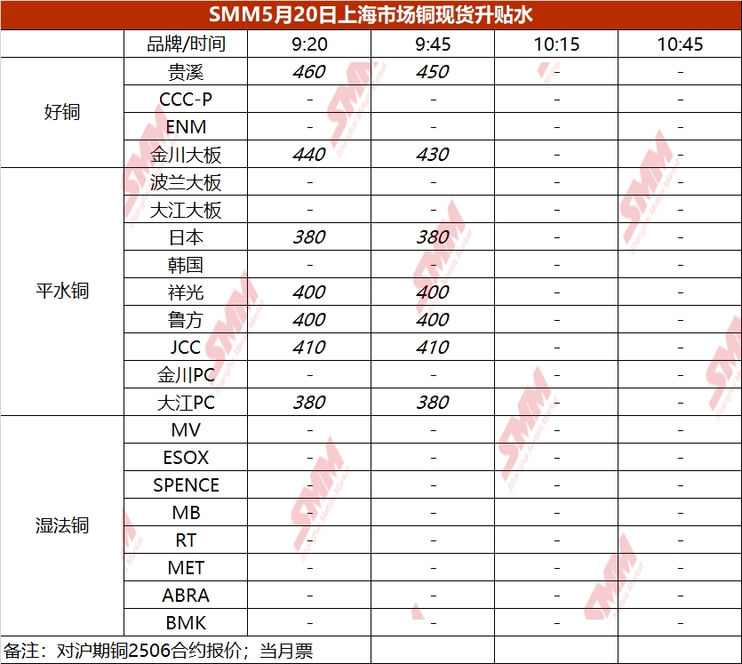 5月20日上海市场铜现货升贴水(第二时段)【SMM价格】