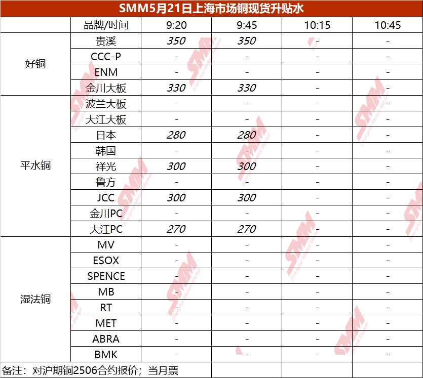 5月21日上海市场铜现货升贴水(第二时段)【SMM价格】