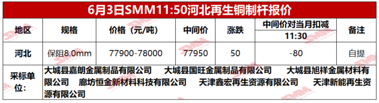 6月3日SMM河北地区再生铜制杆报价