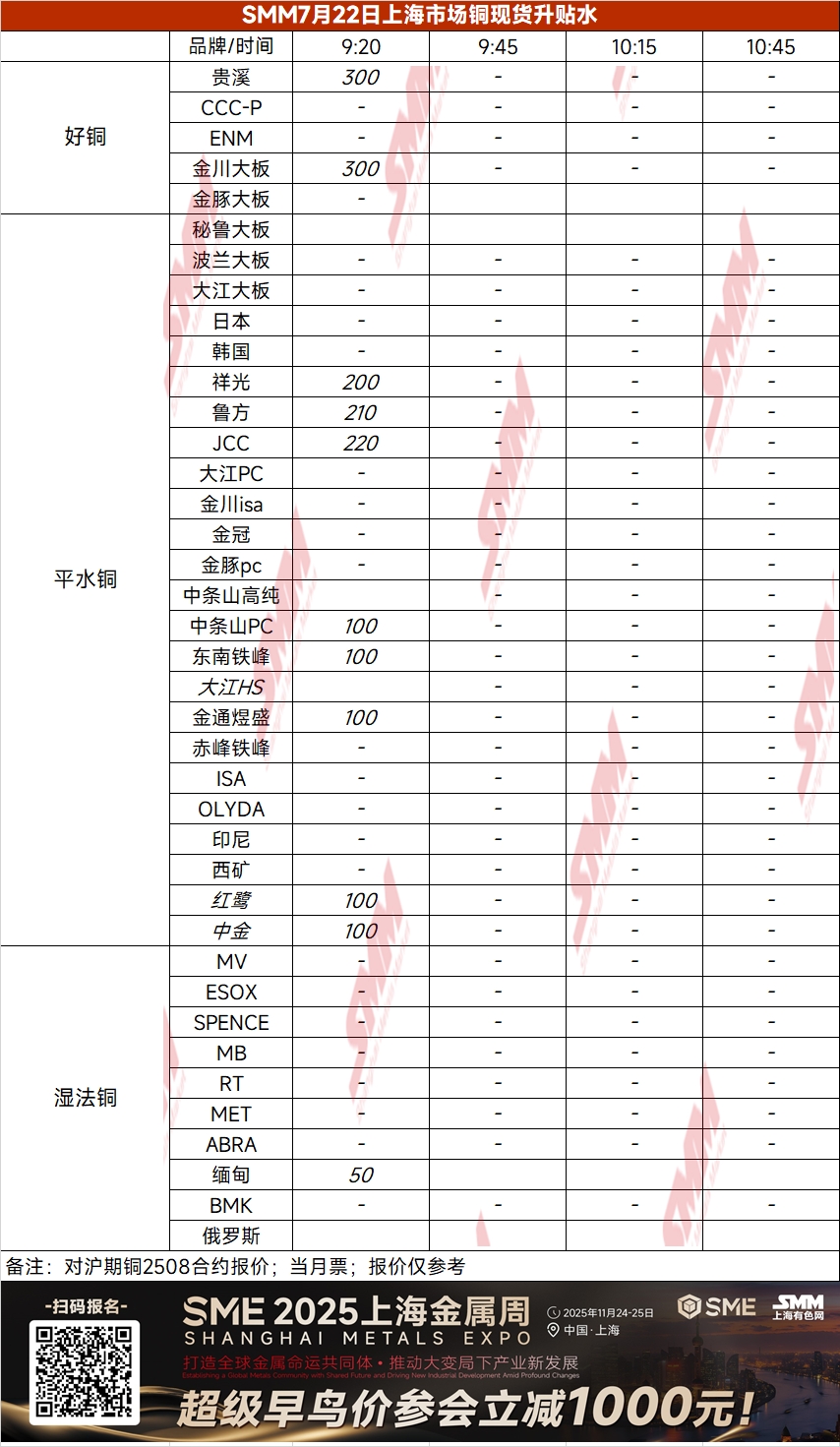 7月22日上海市场铜现货升贴水(第一时段)【SMM价格】