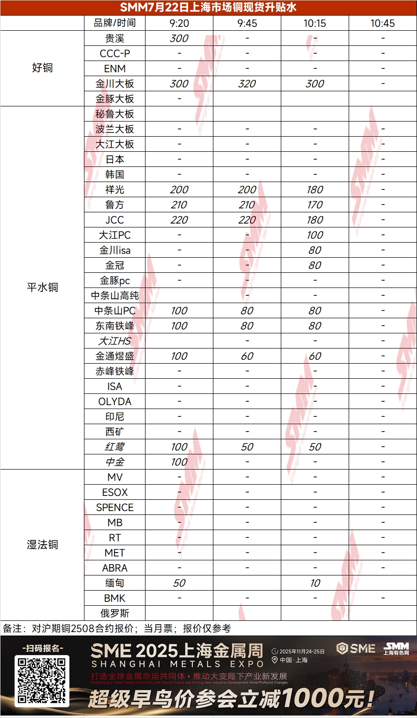 7月22日上海市场铜现货升贴水(第三时段)【SMM价格】