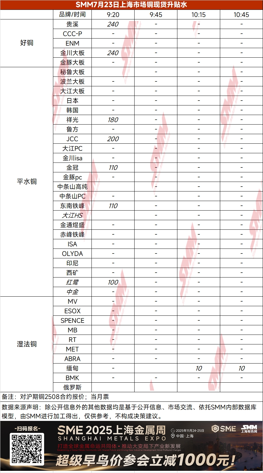 7月23上海市场铜现货升贴水(第一时段)【SMM价格】