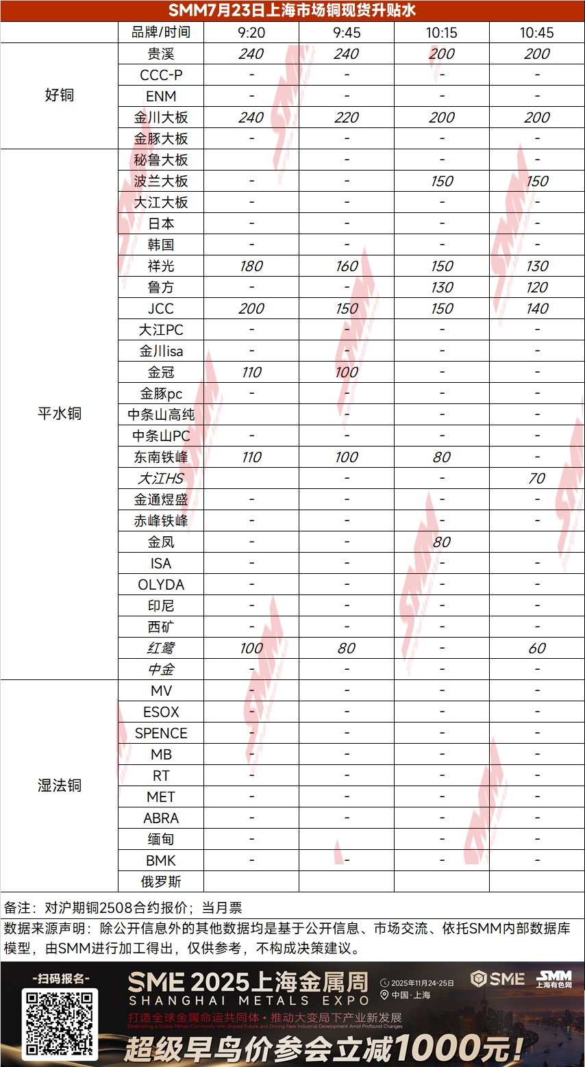 7月23日上海市场铜现货升贴水(第四时段)【SMM价格】