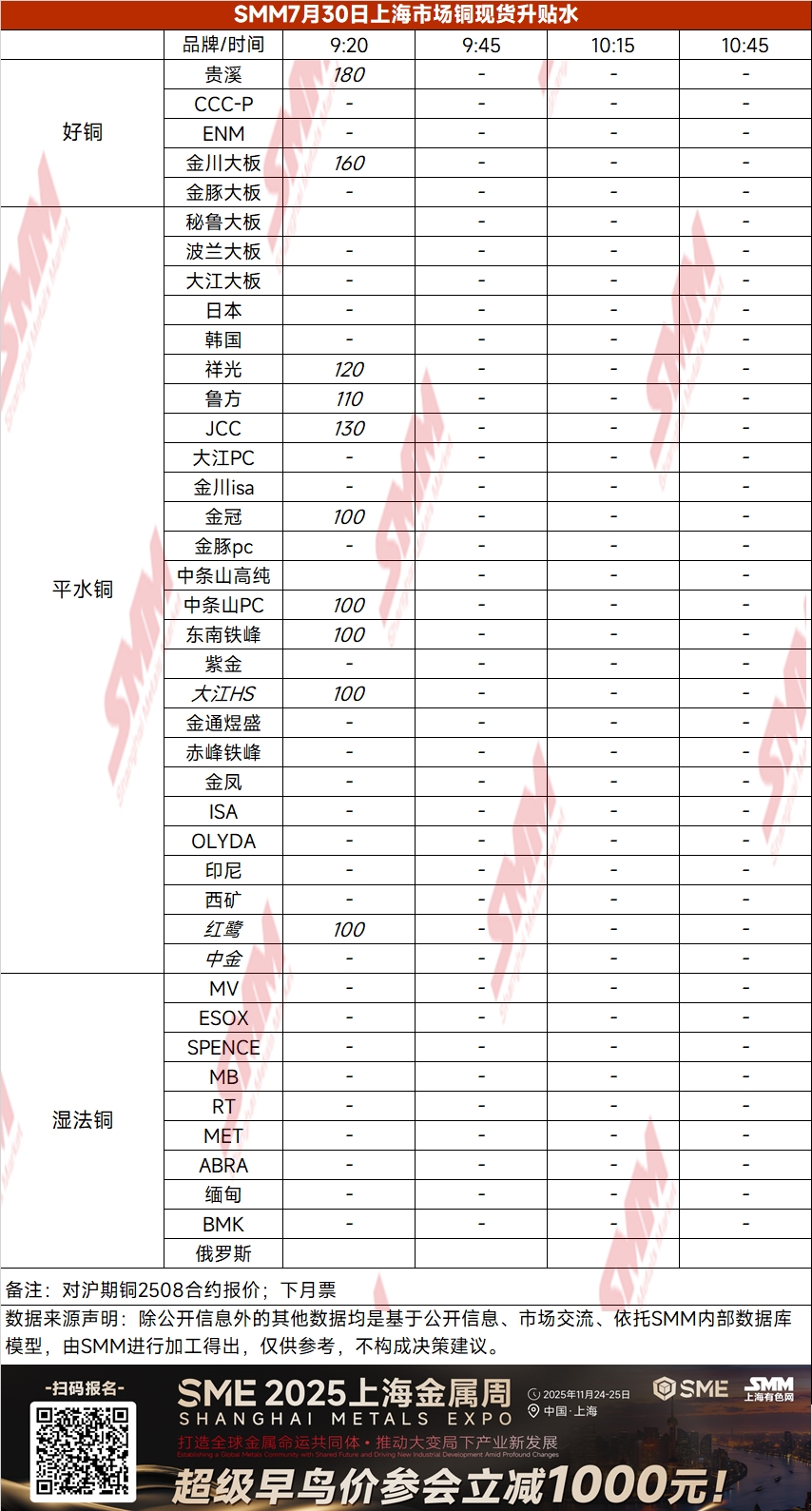 7月30日上海市场铜现货升贴水(第一时段)【SMM价格】