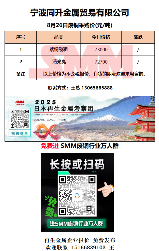 今日同升金属 废铜采购报价已更新,有货的朋友欢迎联系我们!