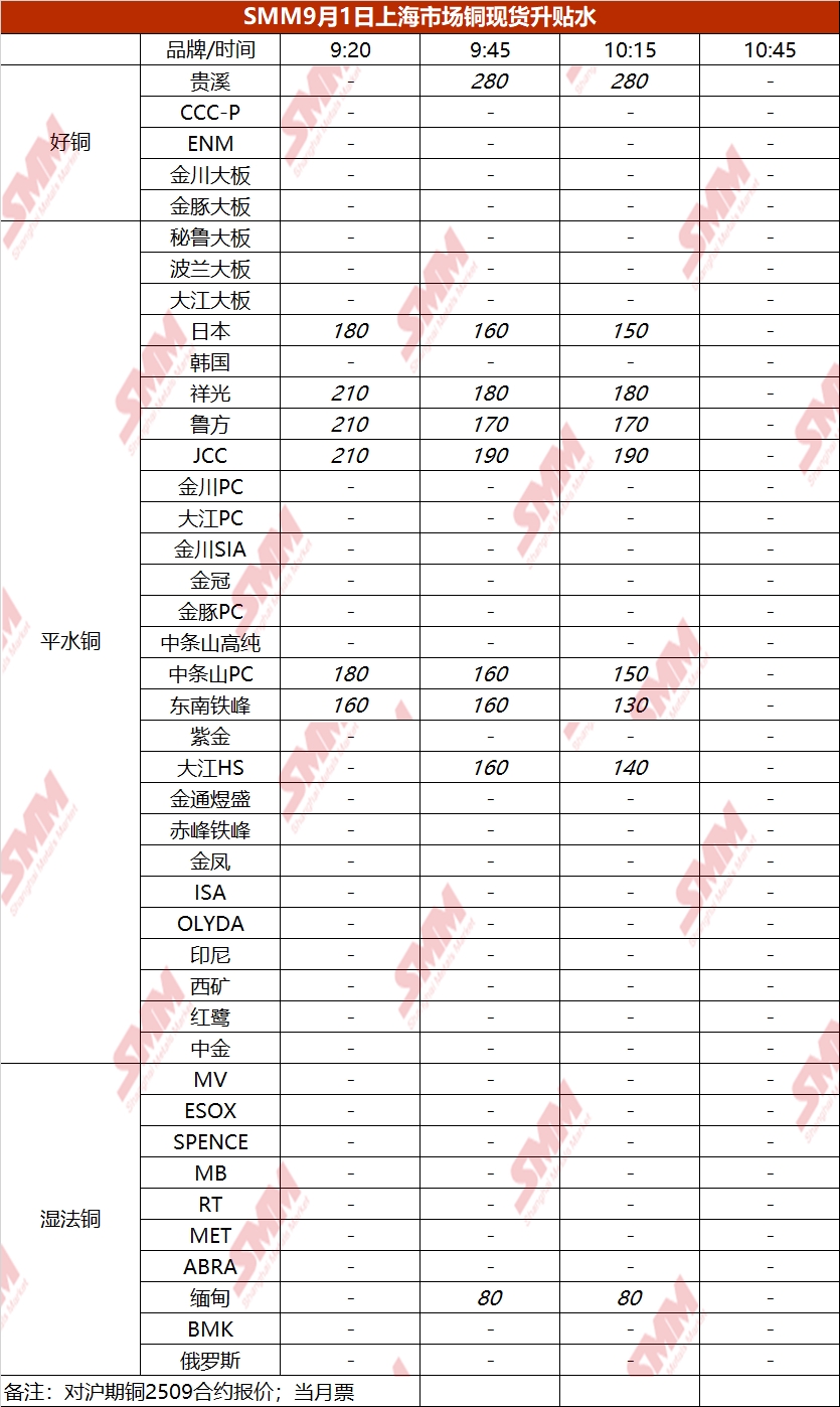9月1日上海市场铜现货升贴水(第三时段)【SMM价格】