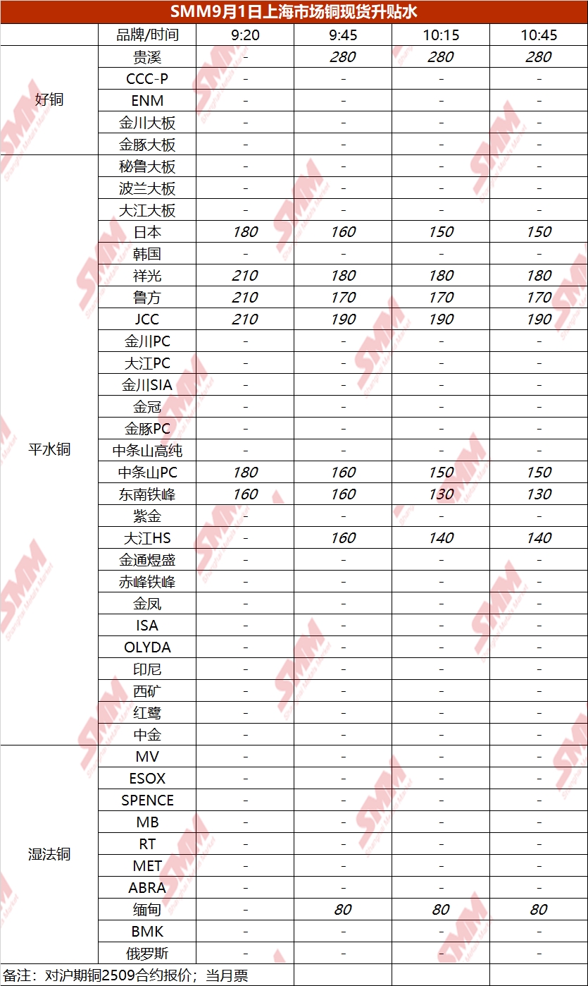 9月1日上海市场铜现货升贴水(第四时段)【SMM价格】