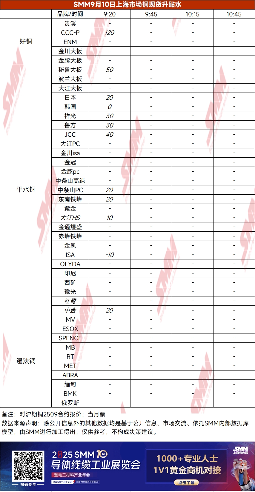 9月10日上海市场铜现货升贴水(第一时段)【SMM价格】