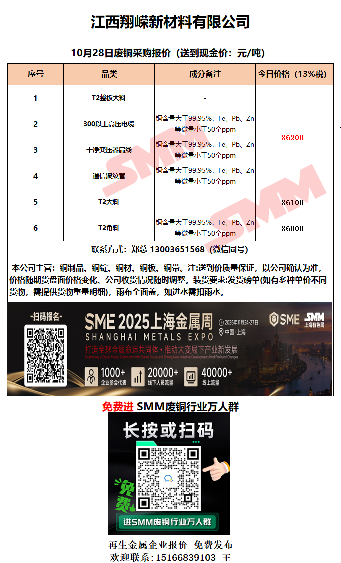 10月28日江西翔嵘新材料 废铜采购报价