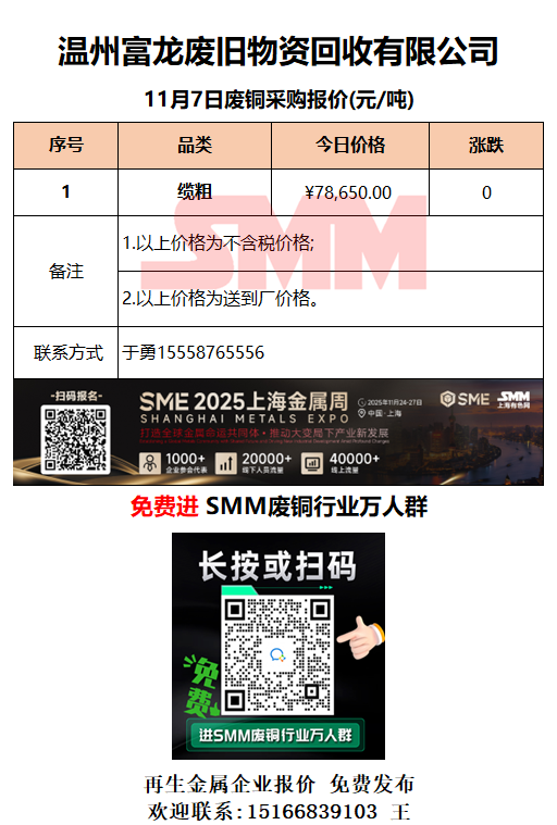 11月7日温州富龙废旧 废铜采购报价