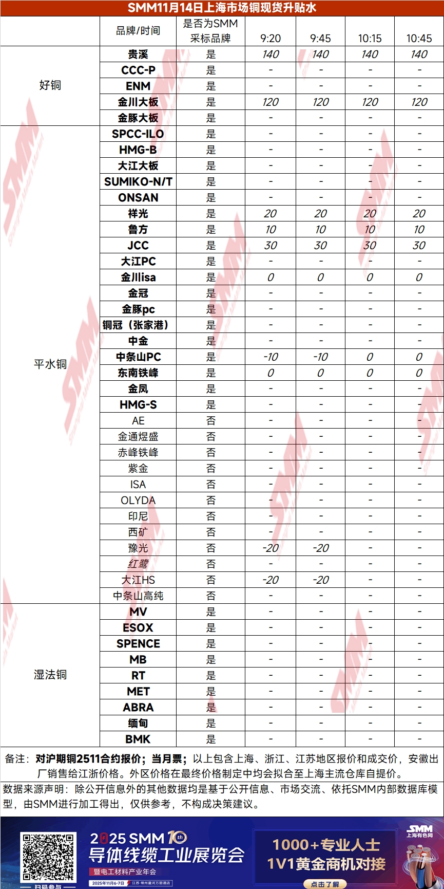 11月14日上海市场铜现货升贴水(第四时段)【SMM价格】