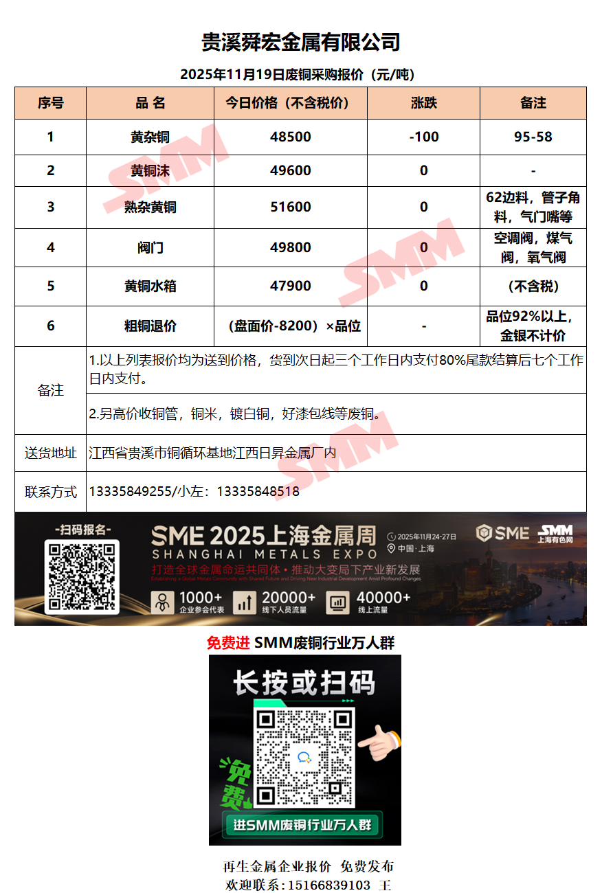 11月19日贵溪舜宏 废铜采购报价