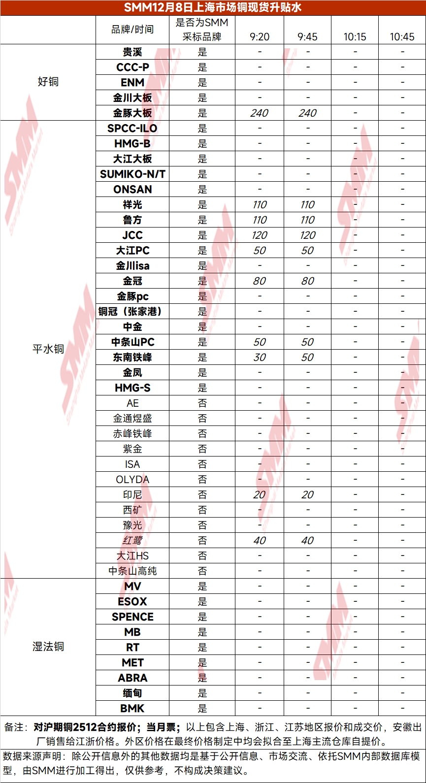 12月9日上海市场铜现货升贴水(第二时段)【SMM价格】
