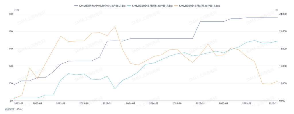 SMM预计12月中国铜箔企业开工率将延续涨势,以亮眼表现完成2025年收官。锂电铜箔方面,动力端口一方面年末继续进行传统冲量,另一方面因明年购置税政策影响将对需求形成支撑。储能端,海外市场随着关税政策明朗化,"抢出口"节奏趋于理性,但下半年积累的海外订单仍为四季度需求奠定基础。电子电路铜箔方面,预计订单整体平稳,新兴高端产业维持亮眼表现,同时海外市场存在节前备货需求。整体而言,在终端需求支撑下预期铜箔行业仍处高景气度区间。