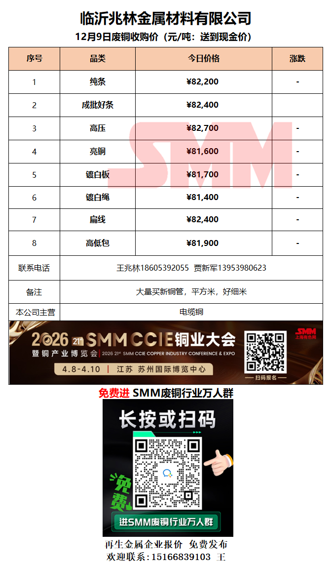 12月9日临沂兆林金属 废铜采购报价