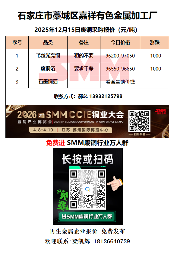 12月15日嘉祥有色金属 废铜采购报价