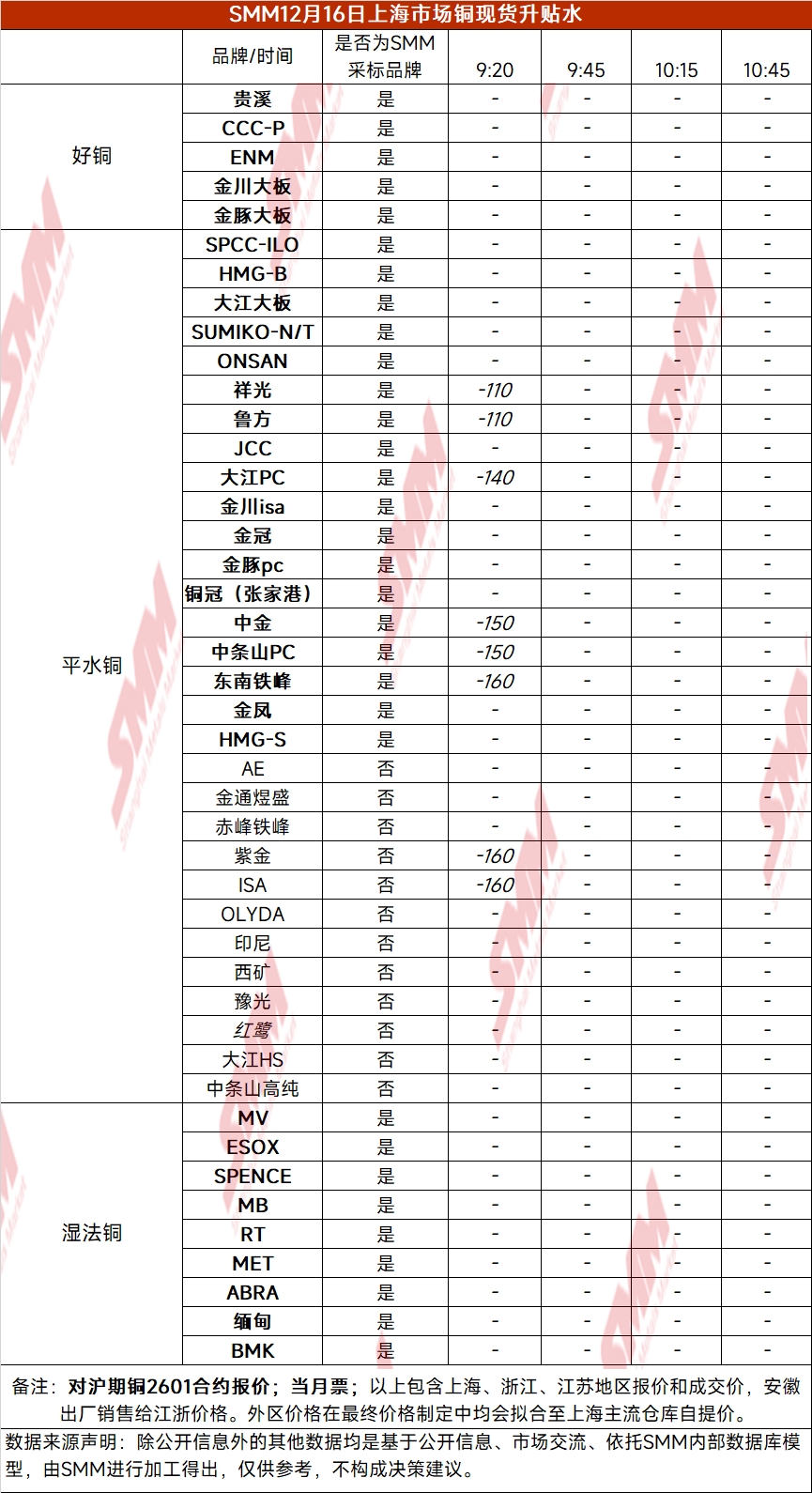 12月16日上海市场铜现货升贴水(第二时段)【SMM价格】